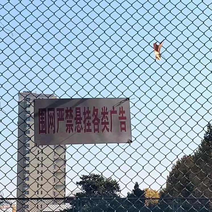 一片落叶挂在高高的铁丝网上,而下方贴着“围网严禁悬挂各类广告”的标识。铁网后是葱茏的树木和蔚蓝的天空,但落叶的颜色显示出秋季已经到来。
