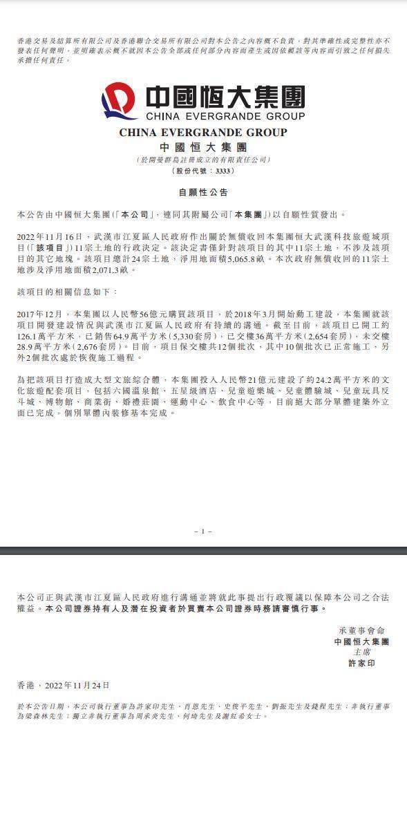 2022年11月24日晚间,中国恒大发布公告对近期其位于湖北武汉市江夏区11宗地块被收回一事作出回应。