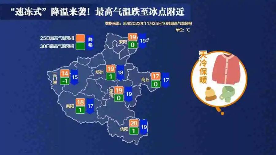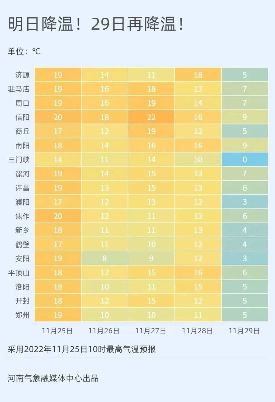 受强冷空气影响,28到29日,全省偏北风5到6级,阵风7到8级、中西部10级左右;全省自北向南气温较前期下降12到14℃,局部可达16℃以上;30日和12月1日早晨全省最低气温西部、北部零下8度到零下6度;其他县市零下5度到零下2度。