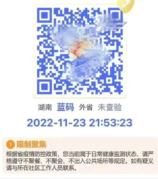 这几天,有不少湖南网友发现,自己的健康码变成了蓝色。之所以出现这种情况,是因为湖南省居民健康码上线了蓝码。由于目前国内疫情防控形势较为严峻,湖南省多地发生入(返)湘人员没有落实落地检措施引起疫情传播的情况,为了更科学精准地做好疫情防控工作,湖南省健康码已上线蓝码。只要是从省外进入湖南未满5天,健康码就会赋蓝码,但已是红黄码的除外,并且弹窗提示“入(返)湘人员未满5天”。