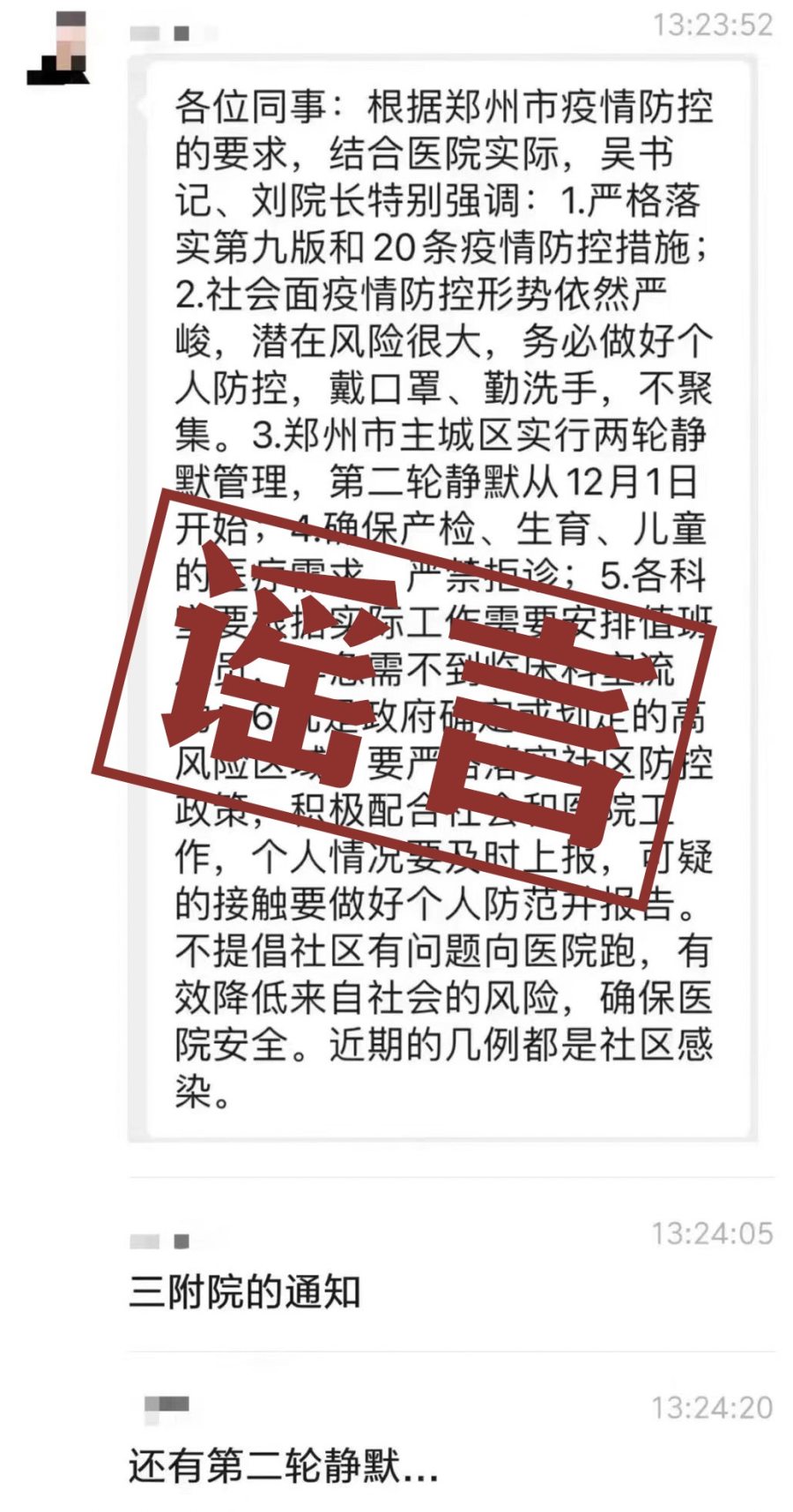11月25日,郑州大学第三附属医院相关负责人告诉记者,朋友圈传的该院涉及疫情防控通知图片为不实信息。