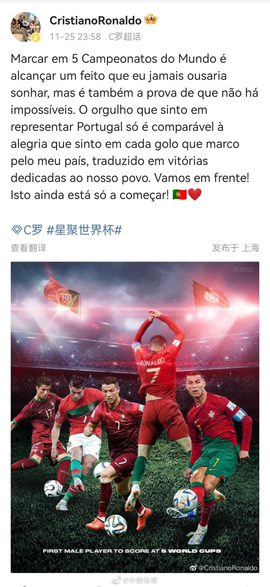 25日晚,C罗@CristianoRonaldo 更新微博,他晒出了自己在5届世界杯上踢球的画面,并写道:“在5届世界杯中取得进球,这是我做梦都不敢想的壮举,但这也证明了没有什么是不可能的。”
