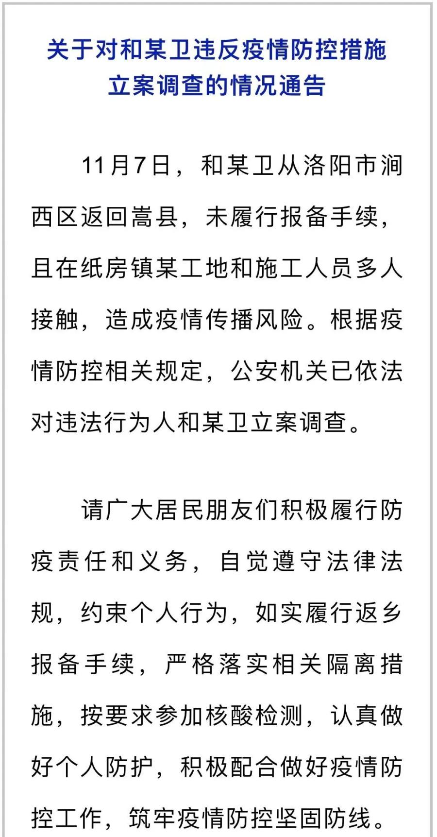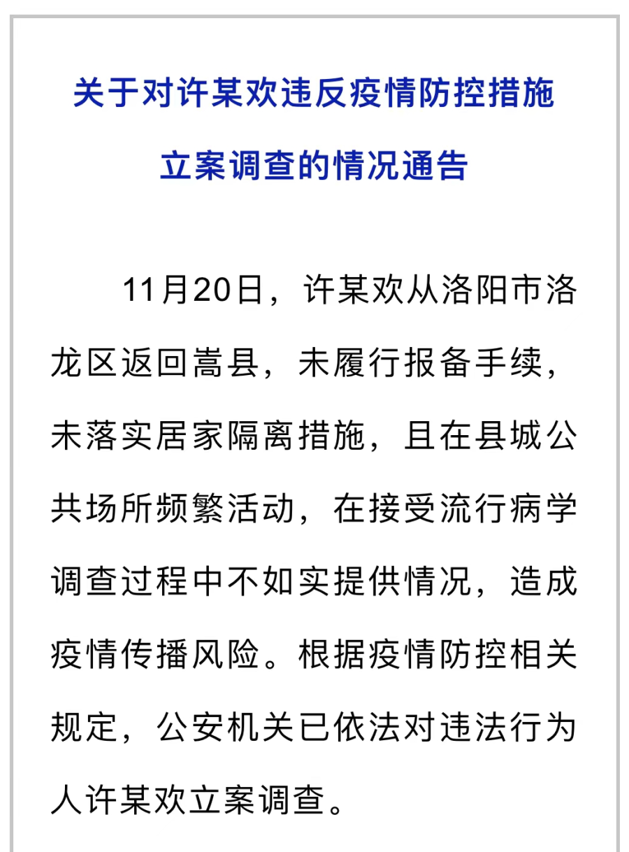 洛阳2人返回未报备,造成疫情传播风险被立案调查