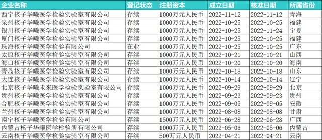 数据统计显示,截至发稿时,核子基因仅在2022年就注册了16家“核子华曦”,注册时间大多集中在近3个月。其中,11月份注册了西宁公司;10月份批量注册了珠海、泉州、厦门、银川、太原、青岛、大连、海口8家公司;9月注册了北京核子华曦未来医学检验实验室有限公司和贵州公司,8月份注册了兰州公司;5月份注册了内蒙公司。核子基因还通过其100%控股的合肥、南宁、云南的核子基因科技有限公司注册核子华曦的合肥公司、南宁公司和云南公司。