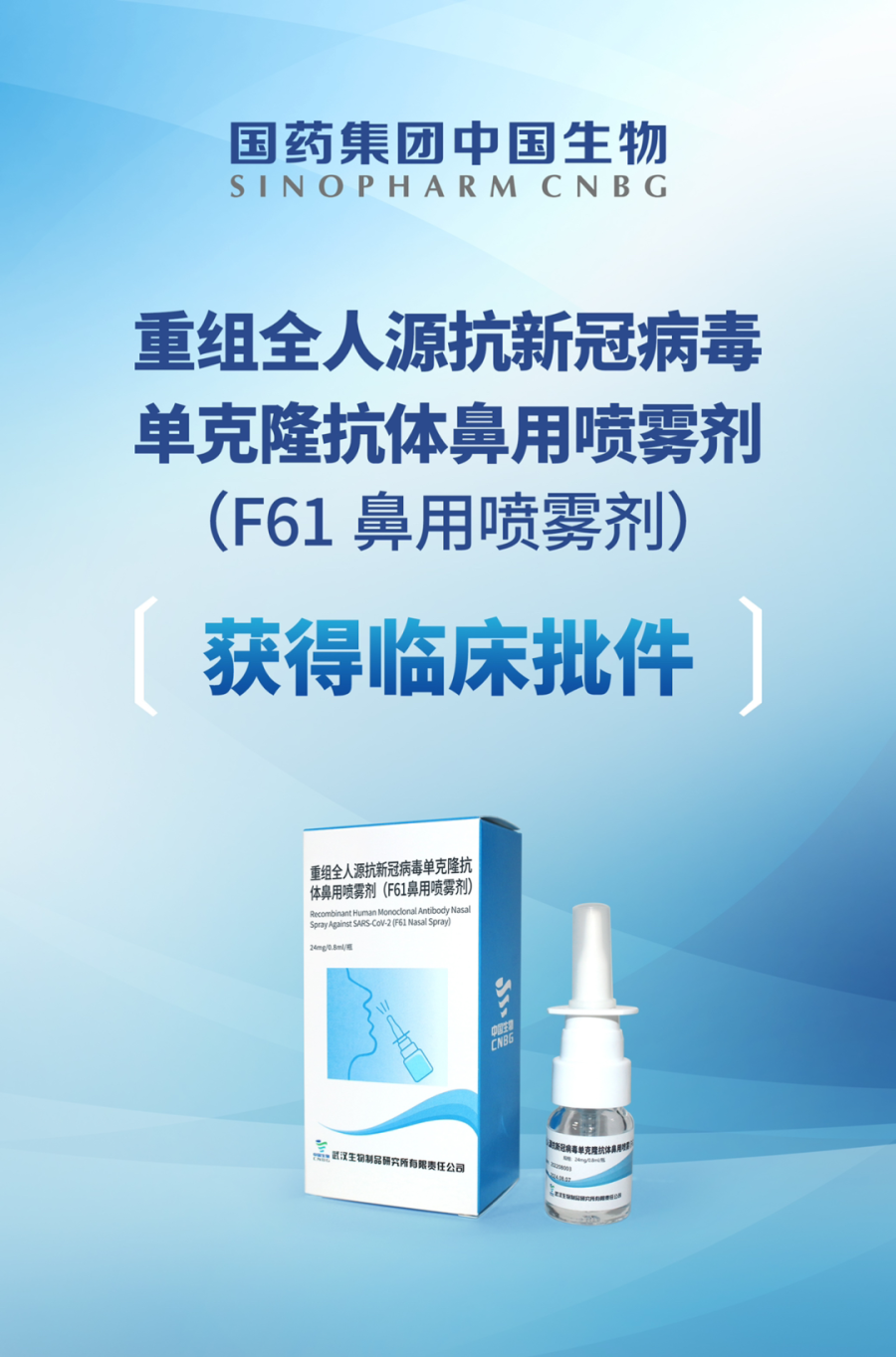 今年7月22日,国药集团中国生物武汉生物制品研究所申报的重组全人源广谱新冠病毒单克隆抗体注射液(F61)获得国家药品监督管理局临床试验批件,并同步推进F61鼻用喷雾剂的研究。