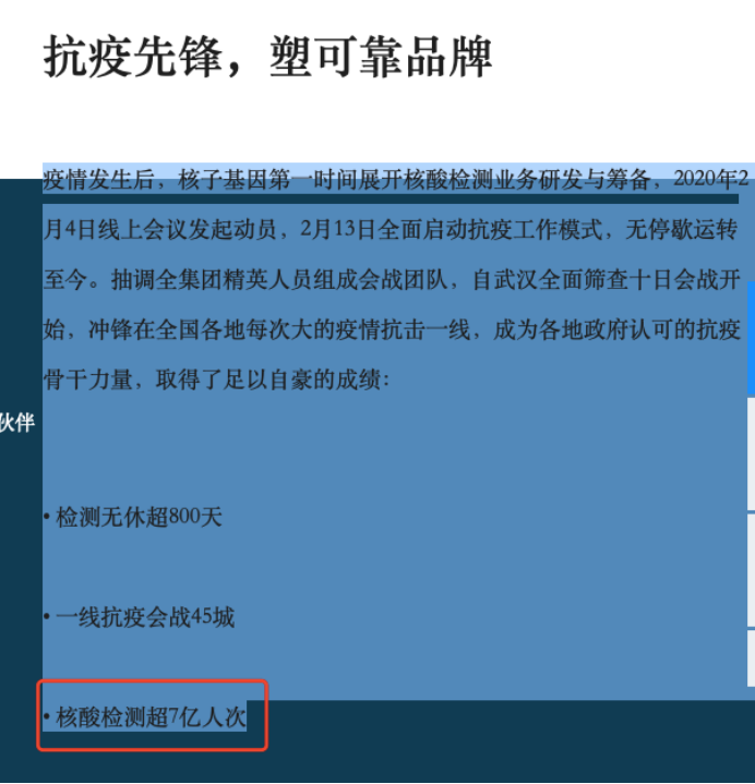 上述文章中还提到,“另外作为国家卫健委全国抗疫的主要力量,参与支援深圳、武汉、北京、张家界、大连、新疆、济南、固安、成都、南京、厦门、仙游、绥化、西安、天津、满洲里、张掖、营口、兰州、杭州、宁波、呼和浩特等全国大部分突发性疫情的抗疫工作,在全国范围内已完成超2亿人份核酸检测。”