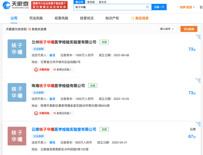 同时,核子基因还在不断扩张。天眼查数据显示,以“核子华曦”为关键词,就能搜索到18家一年以内成立的新公司,其中有17家是在今年成立,涉及的地域包括兰州、云南、珠海等全国各地。