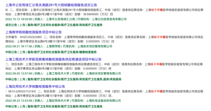 中国政府采购网显示,仅在2022年,核子基因旗下公司共中标了5大项目,为包括北京、上海等地的学校、政府部门以及部分酒店进行核酸检测服务。