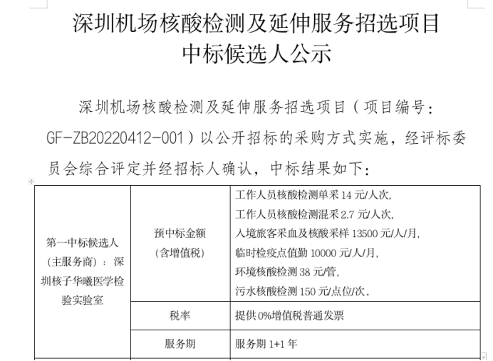 而深圳阳光采购平台公布的数据显示,核子基因在今年9月又中标了一个大项目——深圳机场的核酸检测服务项目,并且是第一中标候选人(主服务商)。核子基因作为主要保障单位,将负责提供工作人员核酸检测服务及延伸服务。