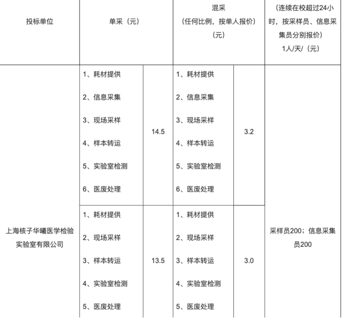 但需要注意的是,上述案例是在疫情初期,而在疫情后的2022年,核子基因的收费标准已大幅降低。今年8月,上海核子华曦医学检验实验室有限公司中标上海应用技术大学核酸检测服务,将在2022年8月-2023年8月,根据上级疫情防控要求,对在校师生以及重点人群进行日常检测。收费标准上,单采为14.5元、13.5元不等,混采价格为3.2元、3元不等,而采样员和信息采集员的价格则均为每人每天200元。