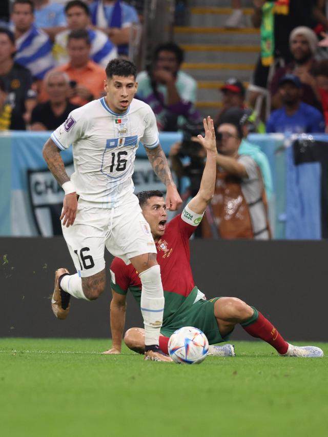 11月28日,葡萄牙队球员克·罗纳尔多(后)被乌拉圭队球员马蒂亚斯·奥利韦拉犯规后。新华社记者 曹灿 摄