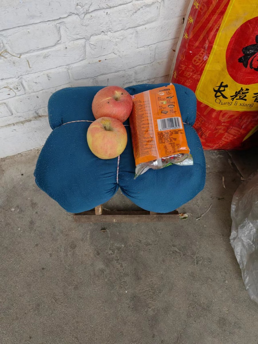 临走的时候,我们把还没舍得吃的苹果、火腿肠留给了让我们能给手机充电的邻居李大姐,放在刘大娘家门口了一些,还有几个留给了让我们烧水的物业保安。