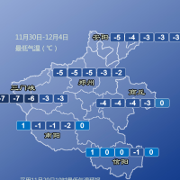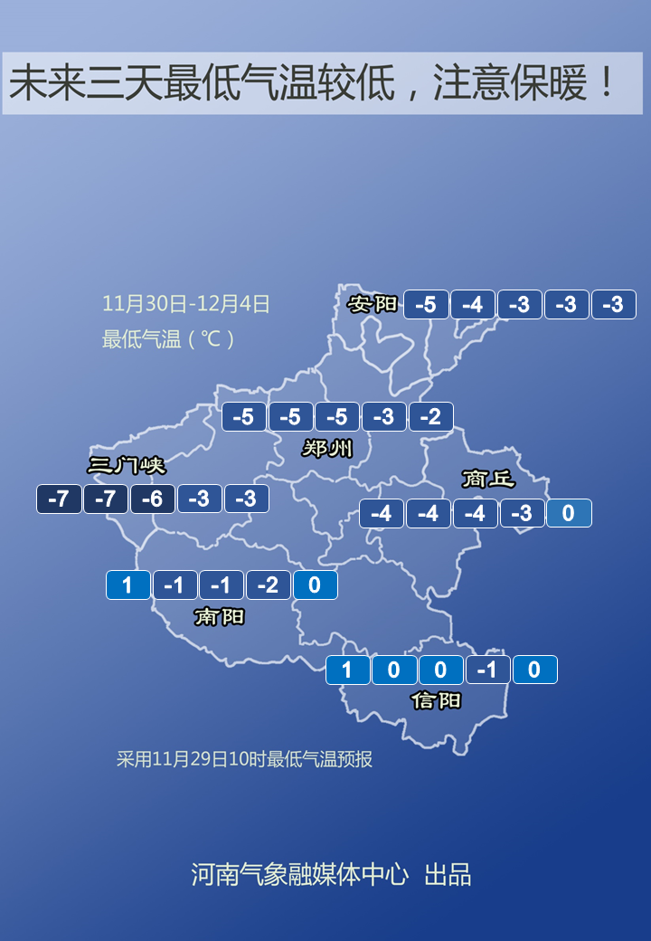 受强冷空气影响,今明两天,全省大部最低气温较前期下降10度以上,东部、东南部和西部、西北部降温幅度达12度以上。明天、12月1日和2日早晨全省最低气温西部、北部降至零下8度到零下6度,局部可达零下10度;其他县市零下4度到零下2度。