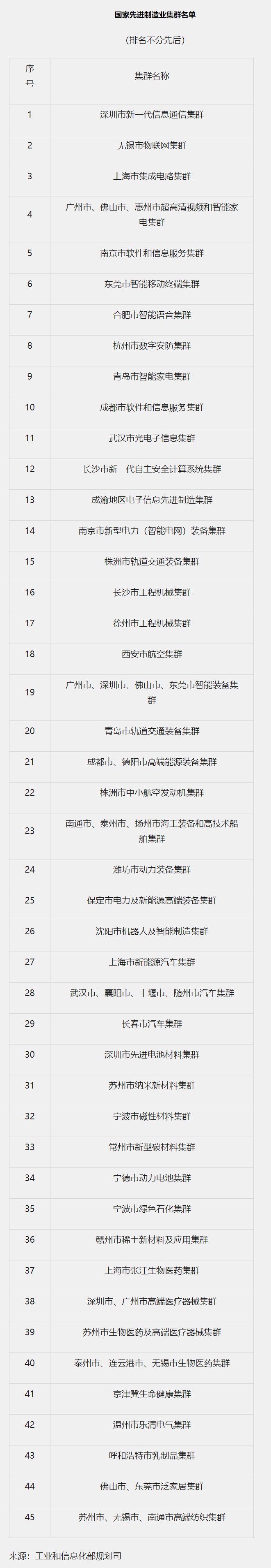 近日,工业和信息化部正式公布45个国家先进制造业集群的名单。