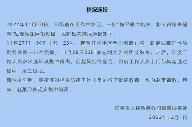 近日,一则“大白暴力拉人去隔离”的视频在网上引发关注。12月1日,杭州市临平区人民政府乔司街道办事处通报称,11月27日,男子赵某与一新冠病毒阳性病例曾在同一时空交集,被判定为密切接触者。之后,防疫工作人员多次通知其集中隔离,但赵某拒绝配合。防疫工作人员上门与其沟通过程中,发生拉扯。事件发生后,街道对相关防疫工作人员进行了批评教育,也向赵某道歉。目前,赵某已按规定集中隔离。