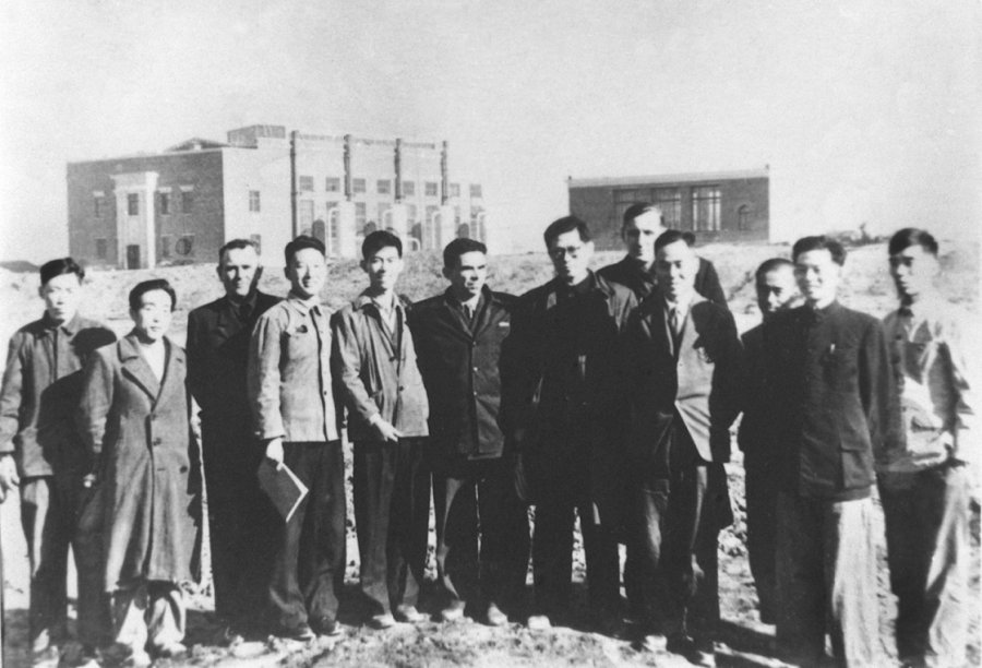 1956年,江泽民同志(左七)在长春第一汽车制造厂同援建一汽的苏联专家等合影。新华社发
