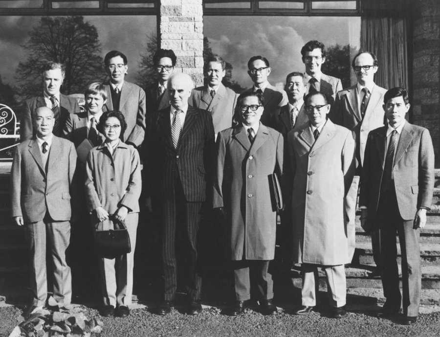 1964年6月,江泽民同志(二排右一)在法国艾克斯莱班出席国际电工委员会会议期间同与会代表合影。新华社发