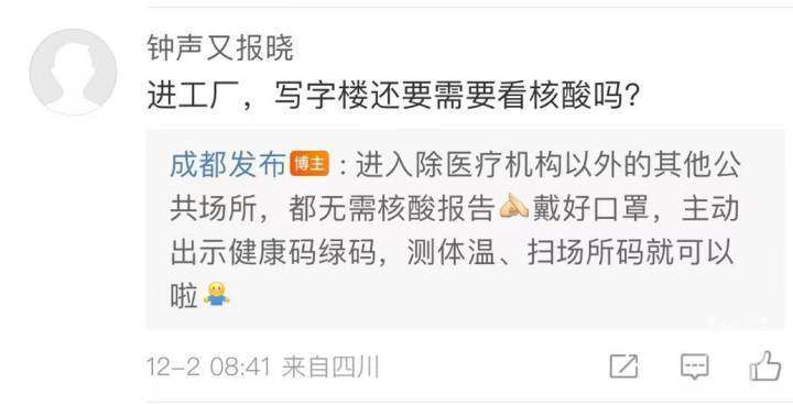 据成都发布,除了进入医疗机构需要查验核酸,进入写字楼、工地等其他公共场所都不再查验核酸。