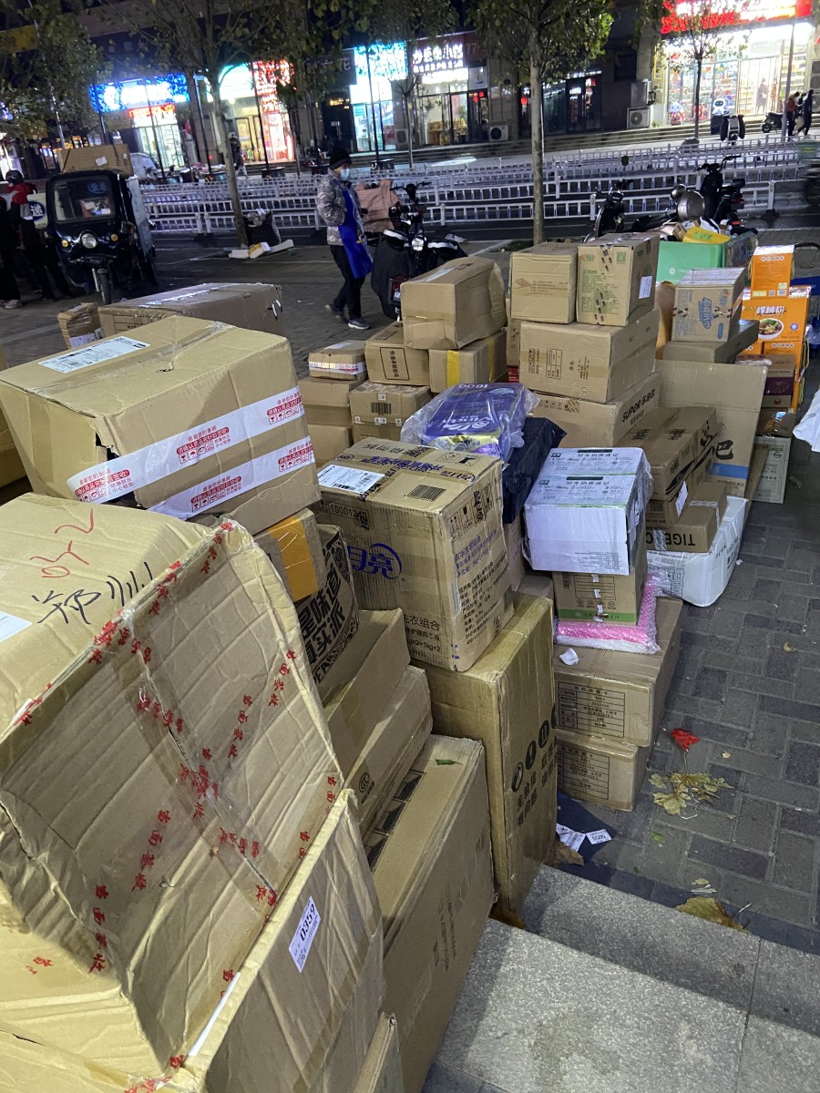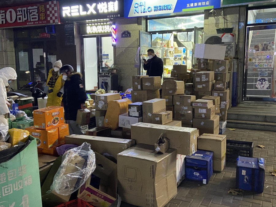 业主小刘用推车载着十几个快递,正从快递站点往家走,“我10月初买的短袖,现在穿着羽绒服来取。买个锅想着居家做饭用,疫情结束了还没拿到手。”