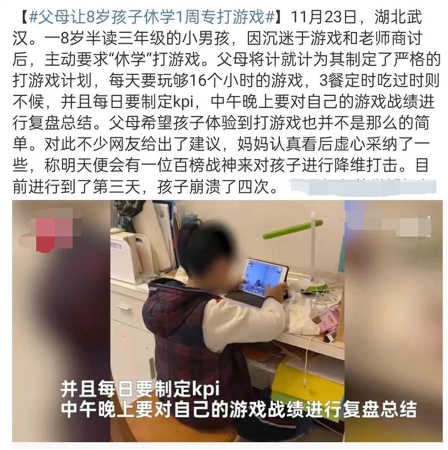 什么是“反向式育儿”?比如前阵子一个8岁的男孩主动要求休学去打游戏,父母觉得既然孩子心意已决,那说什么都没用,干脆将计就计,让孩子痛快打个够。为此他们还制定了严格的游戏计划和kpi,每天必须玩够16个小时,而且还要对游戏战绩进行复盘总结,三餐定时吃,过时不候。听到这个计划后,孩子欣然答应,可执行三天下来,已经崩溃了4次。