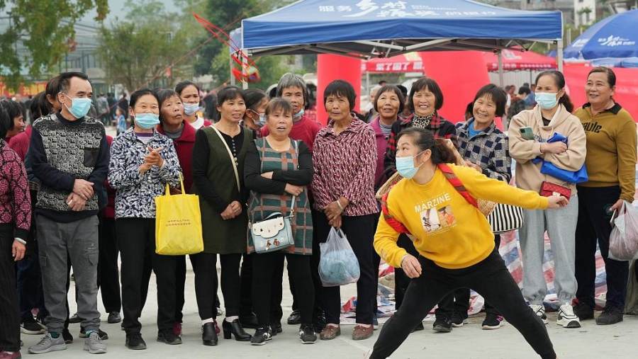 2022年11月22日,广西柳州,在融水苗族自治县三防镇乃文村,一名妇女在抛绣球活动中接绣球。