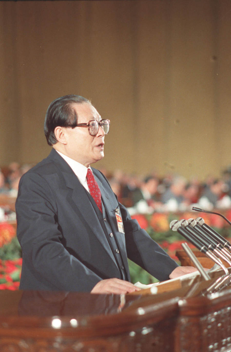 1992年10月12日,中国共产党第十四次全国代表大会在北京人民大会堂开幕。这是江泽民同志代表第十三届中央委员会作报告。