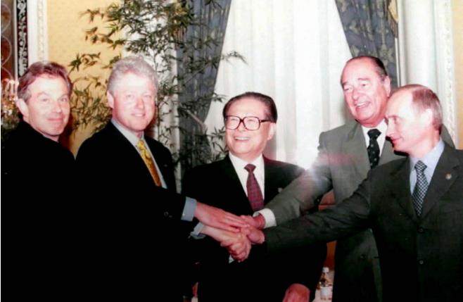 2000年9月7日,由中国倡议的联合国安理会五个常任理事国首脑会议在纽约举行。江泽民同志(中)同法国总统希拉克(右二)、俄罗斯总统普京(右一)、英国首相布莱尔(左一)、美国总统克林顿(左二)握手合影。