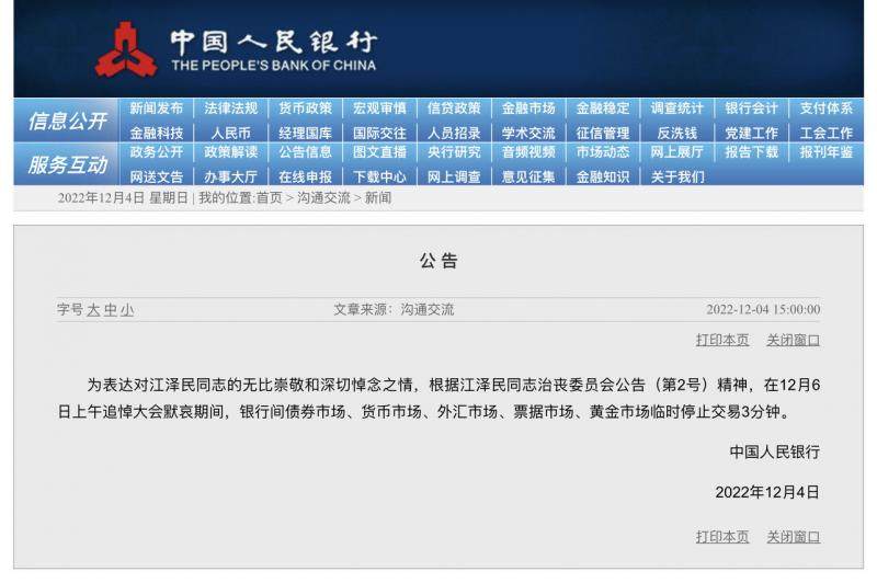 央行:12月6日上午江泽民同志追悼大会默哀期间,银行间债券市场等临时停止交易3分钟