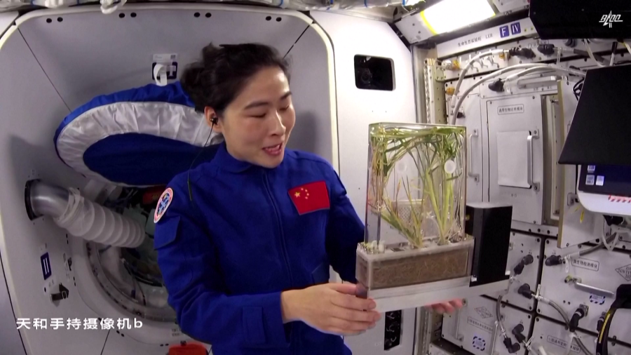 2022年10月12日,“天宫课堂”第三课在问天实验舱开讲,航天员刘洋现场展示水稻吐水现象。中国载人航天工程办公室 供图