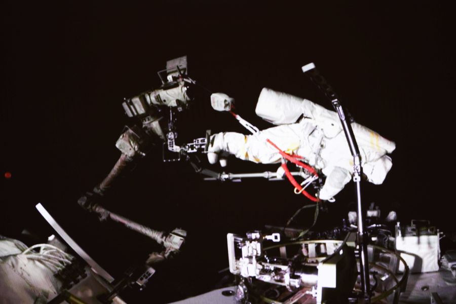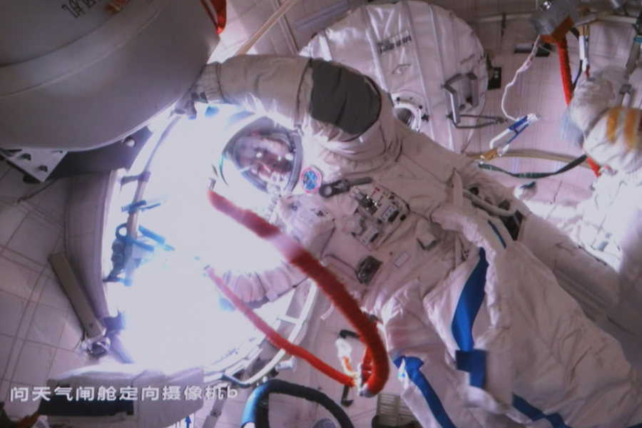 2022年9月2日,神十四航天员进行首次出舱活动。这是在北京航天飞行控制中心拍摄的航天员刘洋(左)结束出舱任务正在返回的画面。