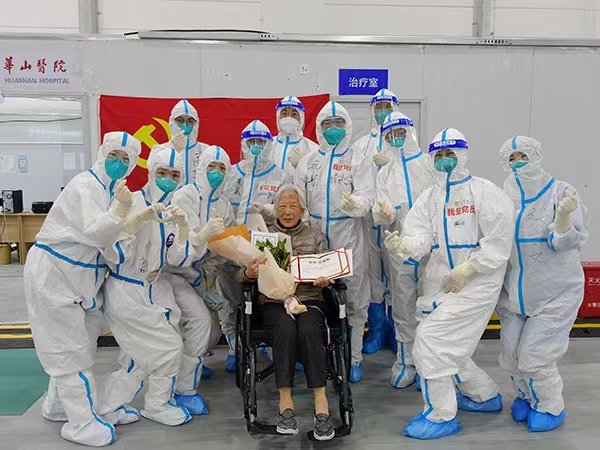 4月30日,在华山医疗队员们的祝福下,王漫如老人康复出院。