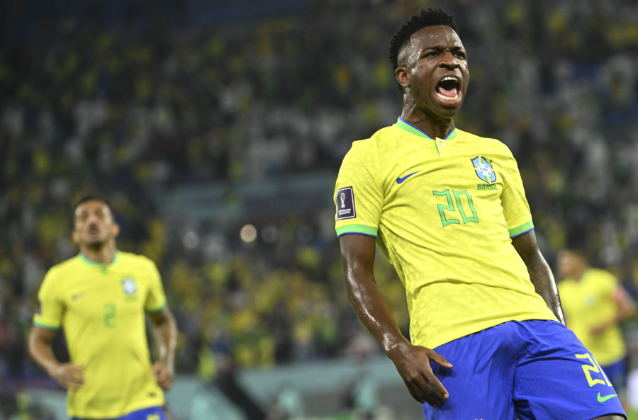 12月5日,巴西队球员维尼修斯在比赛中庆祝进球。当日,在卡塔尔多哈974球场进行的2022卡塔尔世界杯足球赛八分之一决赛中,巴西队对阵韩国队。新华社记者 李尕 摄