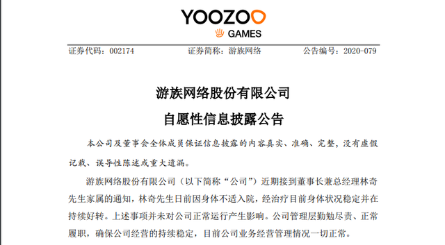 12月23日晚,深交所上市公司游族网络披露公告予以回应。公告称,近期接到董事长兼总经理林奇家属的通知,林奇日前因身体不适入院,经治疗目前身体状况稳定并在持续好转。