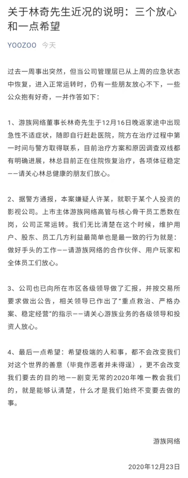 其一,游族网络董事长林奇先生于12月16日晚返家途中出现急性不适症状,随即自行赶赴医院,院方在治疗过程中第一时间与警方取得联系,目前治疗方案和原因调查双线都有明确进展,林总目前正在住院恢复治疗,各项体征稳定——请关心林总健康的朋友们放心。