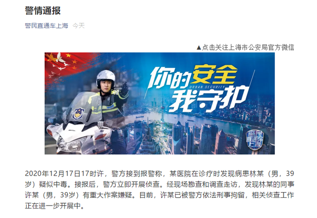当日,“警民直通车上海”发布的警情通报显示,12月17日17时许,警方接到报警称,某医院在诊疗时发现病患林某(男,39岁)疑似中毒。