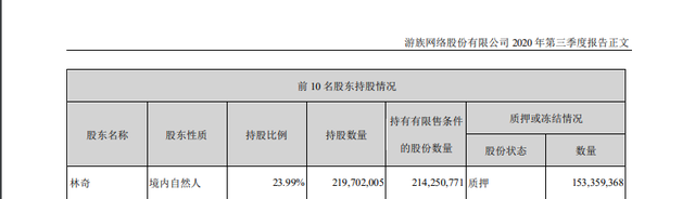 截至今年三季度末,林奇个人持有游族网络23.99%的股份,为公司第一大股东。
