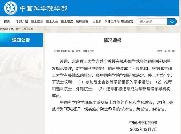 中国科学院学部12月7日发布情况通报,近期,北京理工大学方岱宁教授在线参加学术会议的相关视频引发舆论关注,对中国科学院院士的声誉造成了不良影响。根据北京理工大学有关情况的报告,经中国科学院学部研究决定,停止方岱宁以下院士权利:(1)参加院士会议等学部组织的学术活动;(2)推荐和选举院士、外籍院士;(3)选举和被选举成为学部常设领导机构成员。