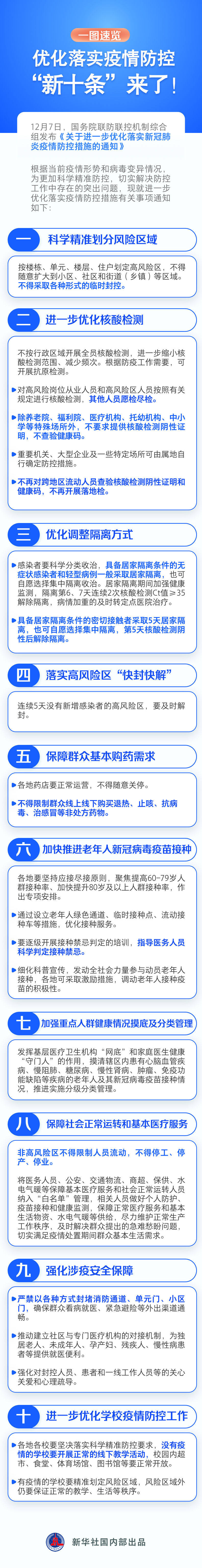 12月7日,国务院联防联控机制综合组出台了《进一步优化落实新冠肺炎疫情防控的措施》,对风险区划定和管理、核酸检测、隔离方式、保障群众就医购药需求、老年人疫苗接种、重点人群健康管理、社会正常运转、涉疫安全保障和学校疫情防控等工作,提出了进一步的优化要求。