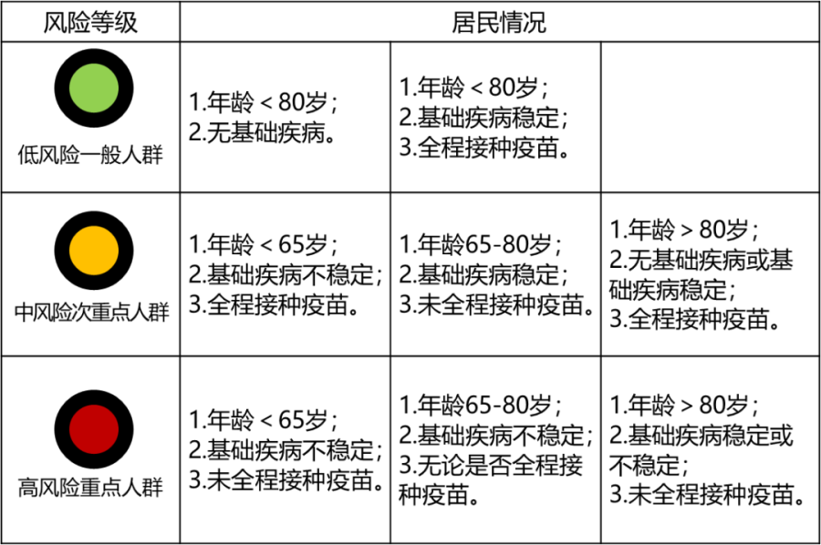 12月7日,国家针对居民不同基础疾病和疫苗接种情况制定了风险评估标准。其中需要同时满足两个条件的人群才划为低风险人群:①年龄小于80岁;②无基础疾病,或者基础疾病稳定且全程接种疫苗。