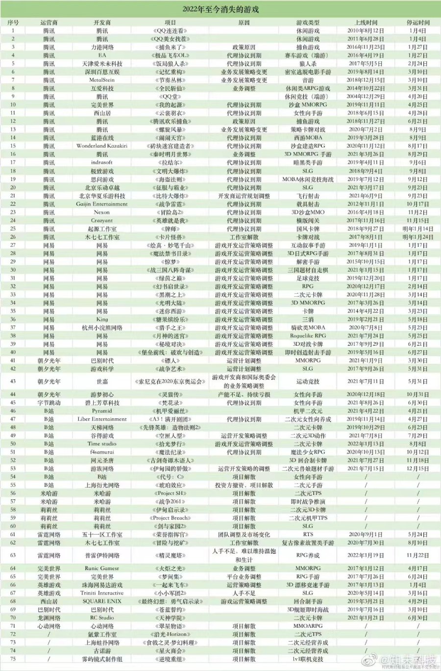 据悉,有超过75款游戏在今年停运,这些游戏有《QQ堂》《QQ连连看》等上线时间早、曾火遍一时的游戏,也有近两年才上线的不知名手游,甚至还有一些游戏项目在研发阶段就胎死腹中。