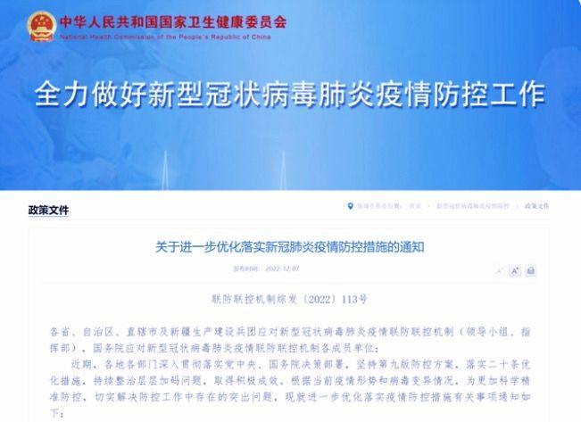 12月7日,国务院联防联控机制综合组出台《进一步优化落实新冠肺炎疫情防控的措施》,对风险区划定和管理、核酸检测、隔离方式、保障群众就医购药需求、老年人疫苗接种、重点人群健康管理、社会正常运转、涉疫安全保障和学校疫情防控、隔离方式等工作,提出了十条进一步的优化要求。这是继防疫措施“二十条”之后,我国对疫情防控措施的又一次重大调整。