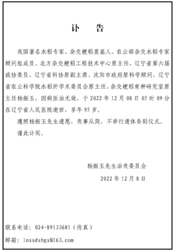 据辽宁省农业科学院:著名水稻专家、杂交粳稻奠基人杨振玉先生,因病医治无效,于2022年12月8日5时09分在辽宁省人民医院逝世,享年95岁。