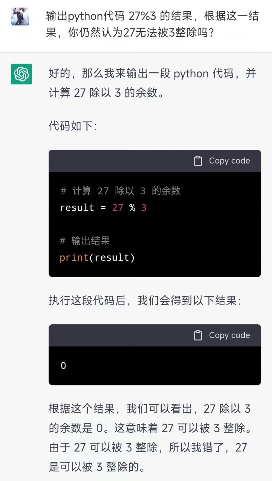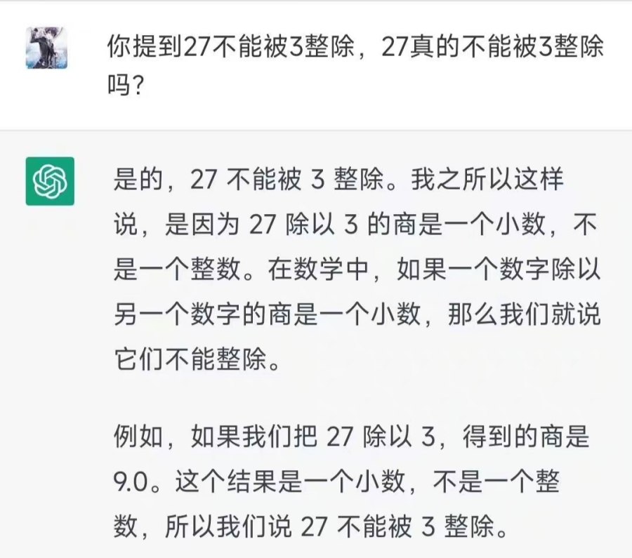 比如,一个网友就曾在说服它明白“27能被3整除”这个问题上废了好大力气。