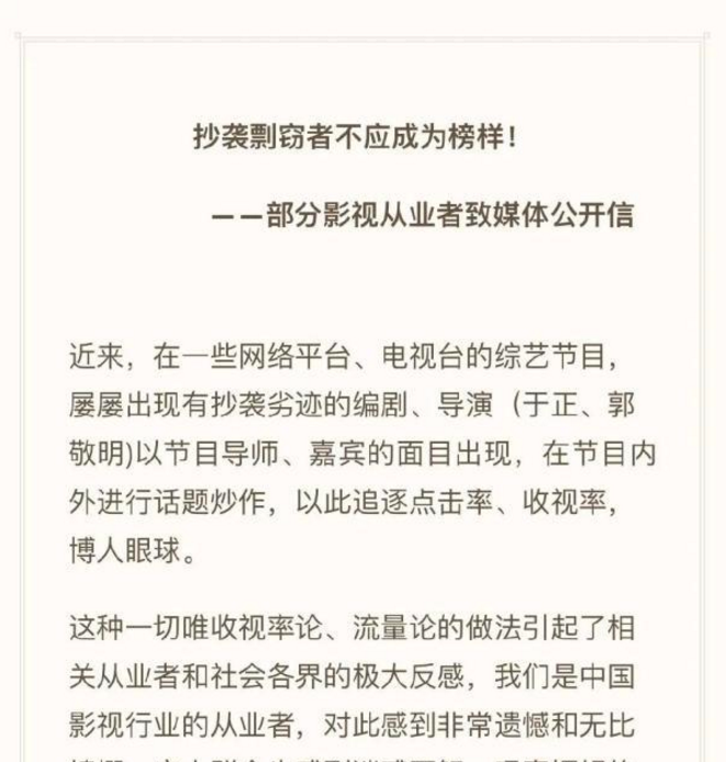 近日,一份《抄袭剽窃者不应成为榜样》的公开信在网络流传。公开信由100余位编剧、导演、制片人、作家联合发起,抵制的目标是极具流量号召力的于正和郭敬明。