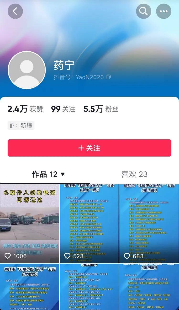 值得一提的是,履新喀什市委书记后,药宁开通了抖音号。截至目前,已发布了12个作品,拥有5.5万粉丝。