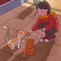 我从网上买来猫粮,又将猫粮放在自家小院的几个盘子里,旁边还有一个小水罐,任由一只只猫随时来吃。有的时候,我去外地或在本市回家较晚,就请隔壁的邻居帮我往盘子里添猫粮,并为小水罐加水。就这样,春去秋来,四季更迭,我喂猫从来也不中断。