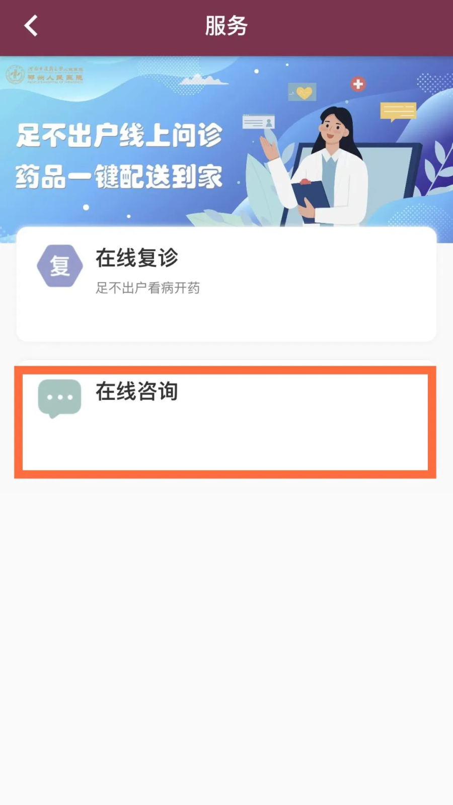 1.微信关注“河南省中医院”→【服务】进入【在线问诊】页面