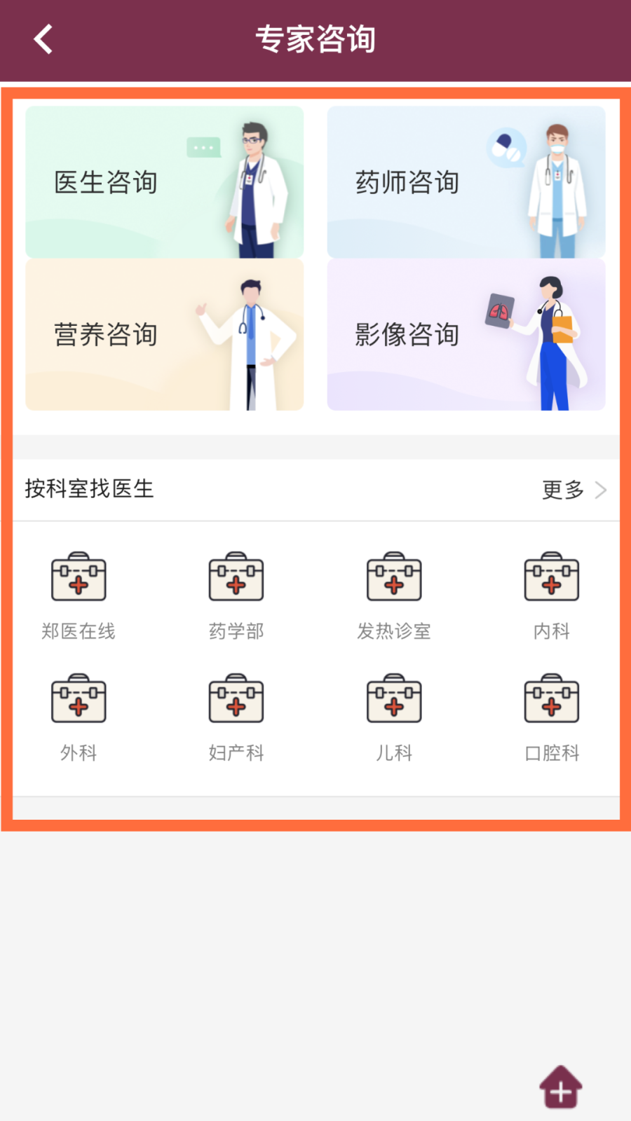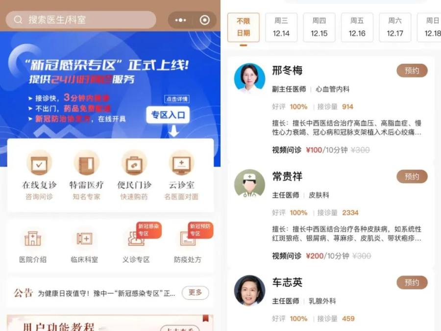 2.点击抗冠专区、复诊等,选择科室及专家发起预约问诊。