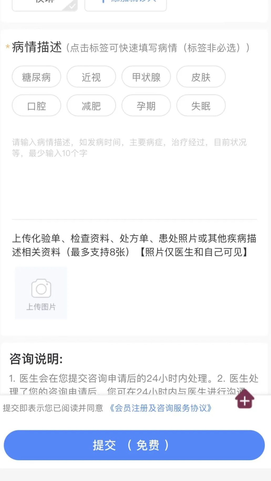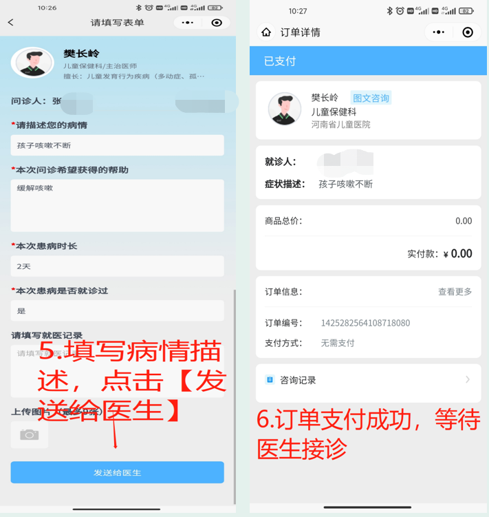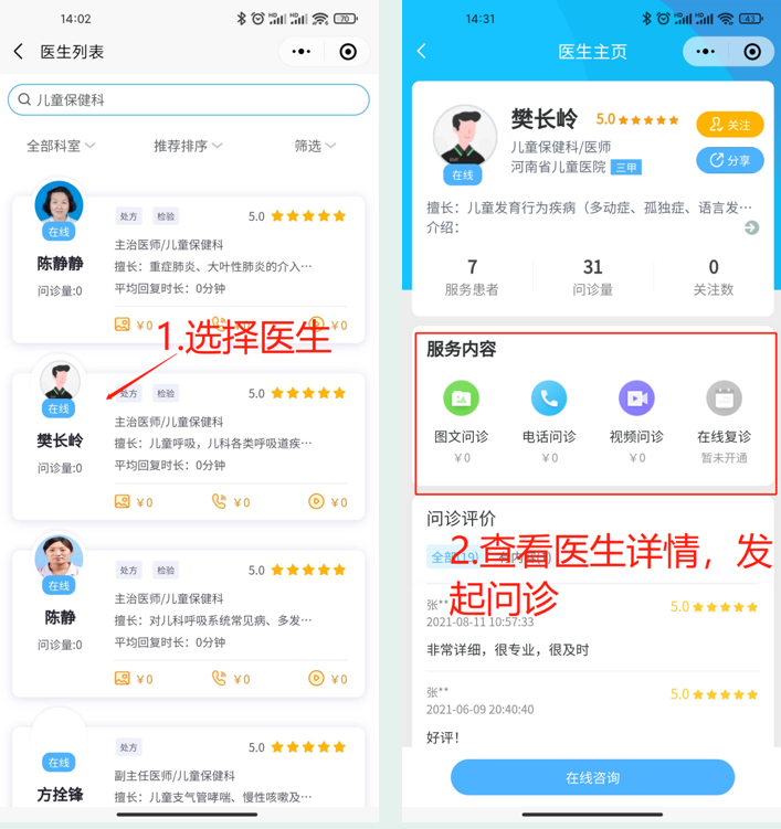2.点击在线咨询,完成患者建档等流程,选择科室及专家发起问诊。