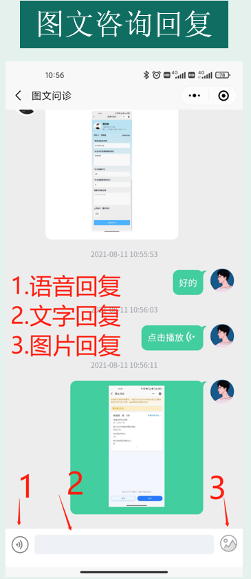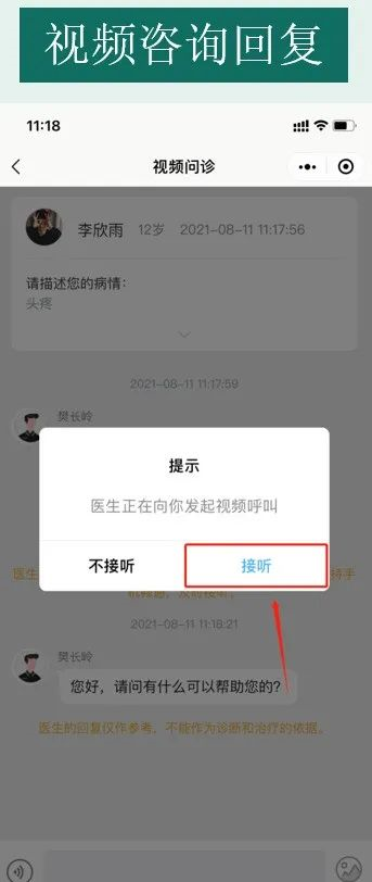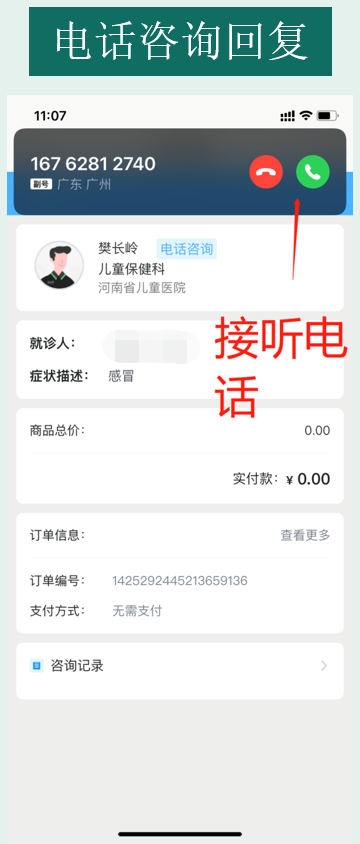 等待医生接诊后,可通过图文问诊、电话问诊、视频问诊的方式与医生进行交流沟通。(注:电话接听过程中调用隐私服务,呈现给医生的电话号码为虚拟号码,保护用户隐私)